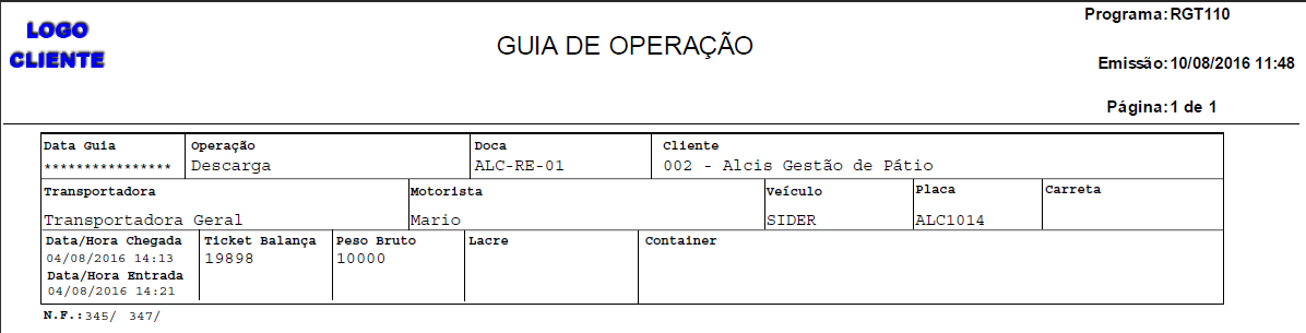 Para ter os controles devidos, como estamos utilizando a balança no exemplo, é necessário coletar o peso na saída para que o sistema tenha os históricos (detalhes na sessão GT100 Balança) e com os dados possibilitar análise de divergências relacionadas ao peso.