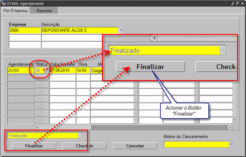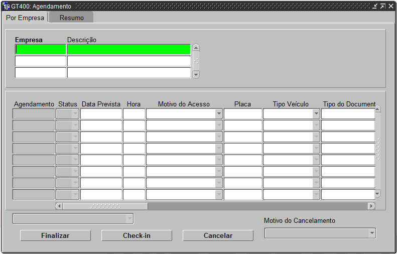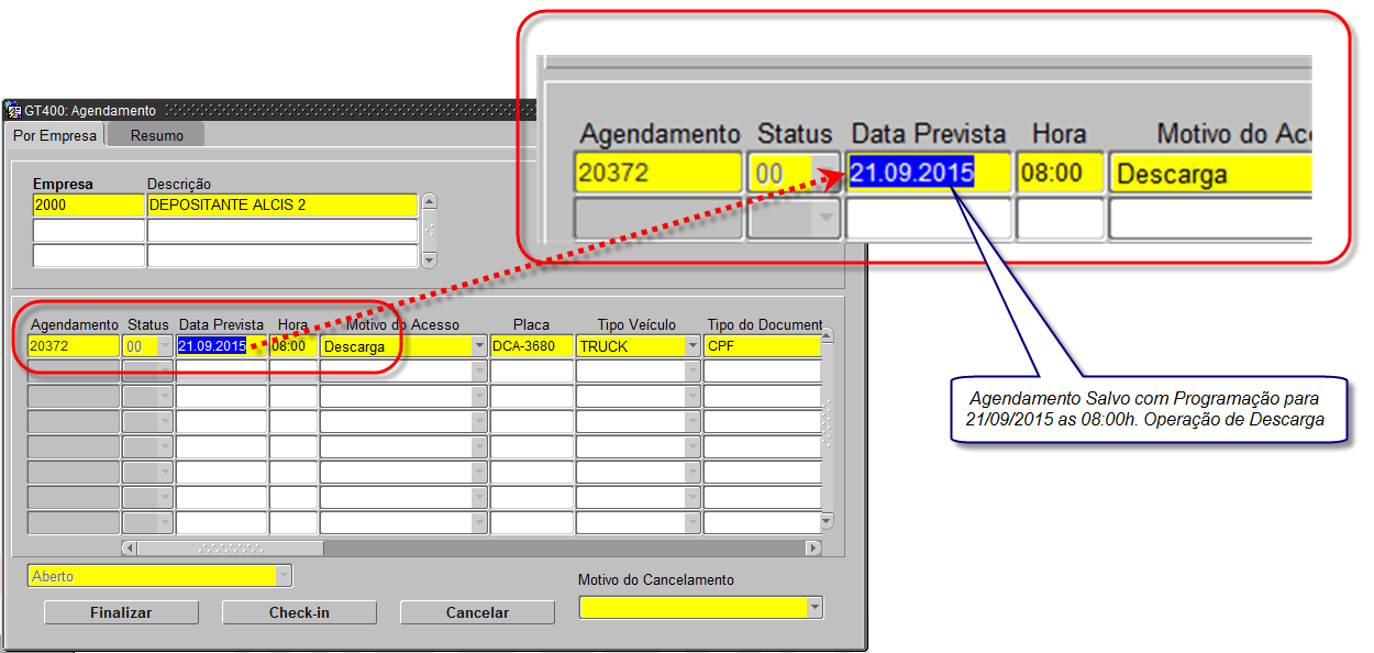 A primeira ação a ser feita é ter um agendamento na tela GT400 o mais completo possível e apto à entrada, conforme explicado na seção anterior, e acionar o botão “Check-in”. O sistema irá manter os dados do agendamento e realizar um “pré inserte de dados” na tela GT100.