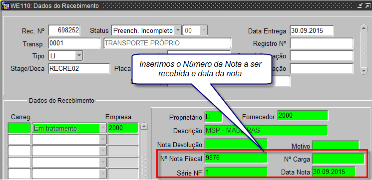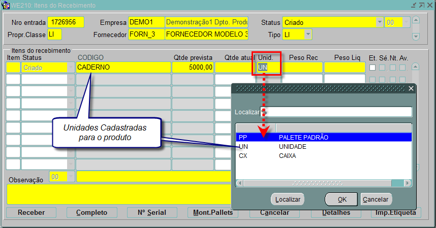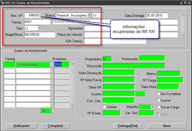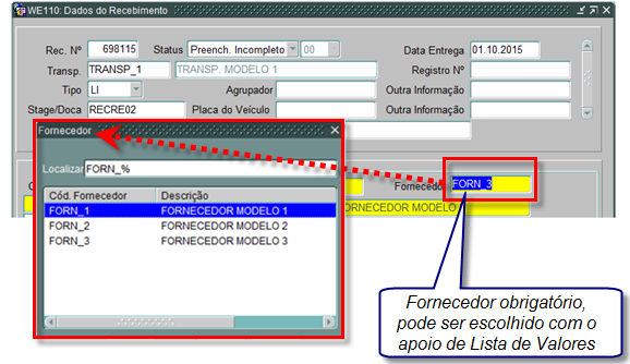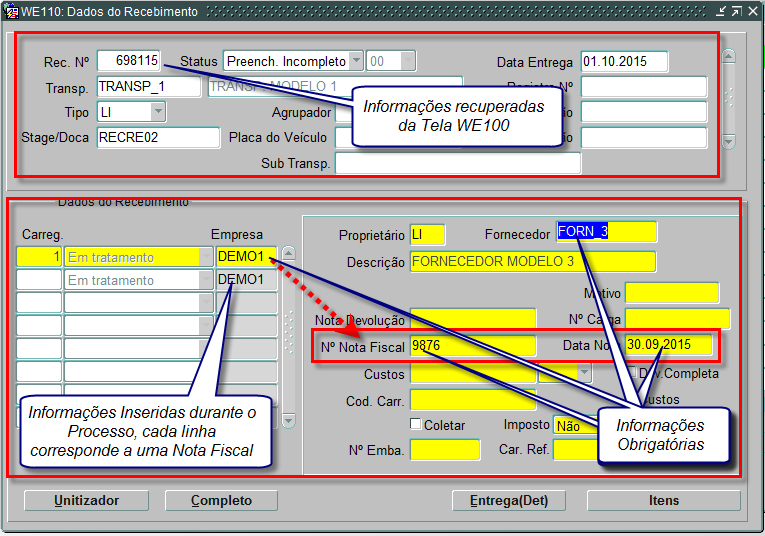 As informações complementares dependem de cadastros que devem estar previamente inseridos no WMS Alcis. Estando cadastrados os dados, podem ser abertos através de lista de valores atribuídos aos campos de inserção. Caso não exista o cadastro, ele deverá ser realizado em tempo de operação.
