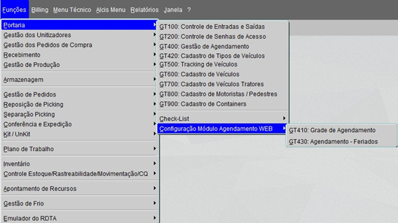 Para consultar o agendamento criado no PWA – Portal Web Alcis no WMS devemos acessar a tela GT400: Gestão de Agendamento, localizada no menu Funções/Portaria/GT400.