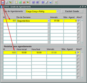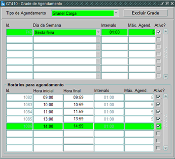 Nessa tela devemos efetuar o registro das grades de agendamento.