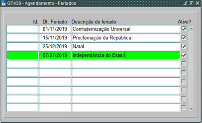 É possível realizar a parametrização dos dias de feriados, para isso será utilizado a tela GT430: Agendamento - Feriados, onde devemos informar o dia do feriado e sua descrição utilizando os campos “Dt. Feriado” e “Descrição do Feriado”, o campo “Ativo?” indica se o cadastro está ativo e se estiver com o flag marcado não será permitido que seja realizado agendamentos naquela data.
