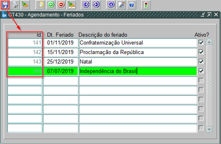 O Id. do agendamento de feriados é gerado após salvar a grade configurada, sendo possível o salvamento com a tecla de atalho “CTRL + S” ou clicando no botão Salvar.