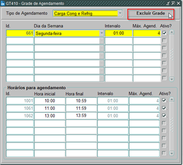 Além de excluir apenas um Id. também é possível excluir toda a grade clicando no botão “Excluir Grade”. É importante lembrar que uma vez realizado este processo não é possível retroceder, vale a pena ressaltar que a grade só será excluída caso não tenha nenhuma grade de agendamento ativo.