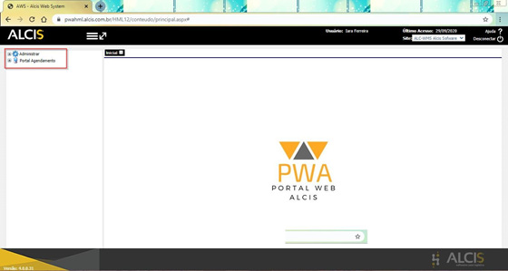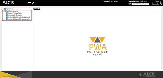 No menu “Administrar” é onde podemos efetuar as configurações do Portal Web Alcis.