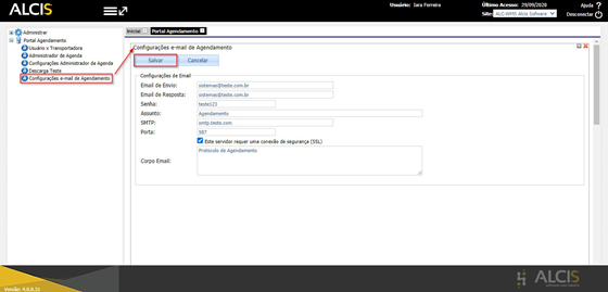 O sistema permite um controle externo de quando é realizado um agendamento, alteração ou cancelamento. É possível cadastrar um endereço de e-mail do usuário responsável por receber e-mails de confirmação, alteração e cancelamento de agendamentos.