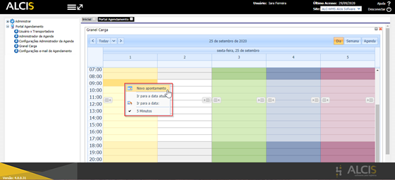 Clicando com o botão direito sobre uma coluna de horário da grade é exibido um pop-up onde é possível fazer um novo agendamento. Para fazer um agendamento basta clicar em “Novo apontamento”.