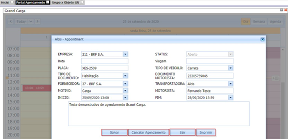 Será exibida a janela com os dados da Grade de Agendamento já efetuado, onde será possível alterar os dados do agendamento (sempre que efetuar uma alteração devemos salvar), cancelar o agendamento, fechar a tela “Sair” ou imprimir um protocolo do agendamento com todos os dados agendados.