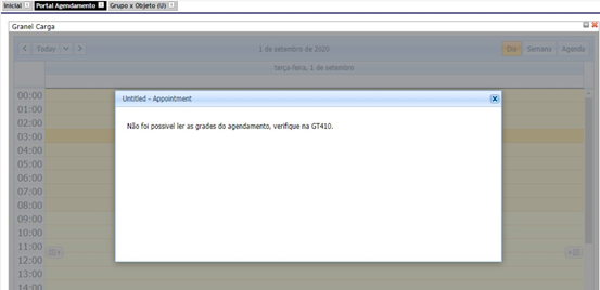 O Portal exibe a informação de que existe algum problema quando tentamos criar um agendamento sem ter sua parametrização ou quando selecionado um horário ou dia em que não é possível efetuá-lo, nesse caso será aberto uma janela pop-up de atenção informando para verificar a grade de agendamentos (Tela GT410 no WMS).