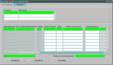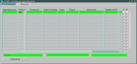 Na aba “Resumo” também é possível efetuar consulta dos agendamentos, utilizando a tecla de atalho “CTRL + F11” no teclado pelos filtros existentes dos campos: Agendamento, Status, Empresa, Placa, Documento do Motorista, Tipo de Veículo ou com um flag em Carga ou Descarga.