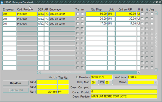 Ao verificar o estoque na tela LS200, temos detalhado a quantidade disponível para realizar a transação.