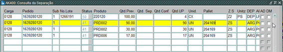 Podemos verificar que temos 3 linhas com status 41 “indicação de pallet Onda”, e todas estão na mesma UZ “204169”, onde temos 02 produtos distintos, o que indica que a reserva gerou uma “Onda Mix”.