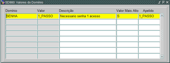 Nesse valor de domínio, o único campo que deve ser alterado, de acordo com a necessidade operacional, é o campo “Valor Mais Alto”; que por sua vez, para ter o resultado esperado, deve ser preenchido apenas com duas opções: “S” ou “N”, conforme abaixo:
