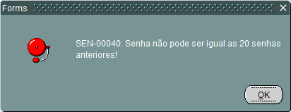 Caso o usuário, na troca da senha, tente utilizar uma das últimas 20 senhas usadas anteriormente, o sistema apresentará mensagem indicativa informando que não é possível utilizar a senha, uma vez que ela já foi usada anteriormente.