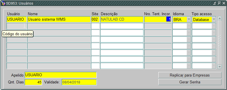 - Uma vez logado, deverá acessar a tela SD953: Usuários.