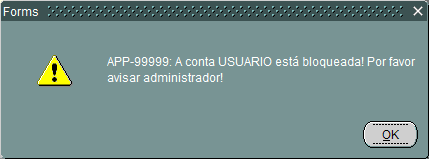 Após realizar a alteração, quando o usuário em questão fizer uma nova tentativa de acesso, o sistema apresentará mensagem indicativa informando o usuário de que o mesmo teve o acesso bloqueado e deverá procurar um administrador do sistema para que este possa efetuar o desbloqueio.