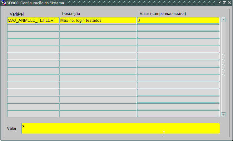 O número de tentativas, até o bloqueio, é parametrizável e pode ser realizado através da tela SD900: Configuração do Sistema (figura abaixo). O parâmetro a ser utilizado é o MAX_ANMELD_FEHLER.