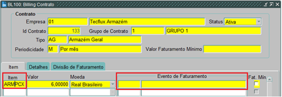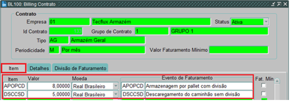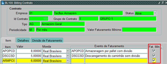 Os eventos que poderão ter faturamento mínimo, deverão ter o flag “Fat. Min.” marcado e no cabeçalho do contrato deve constar o valor para faturamento mínimo.