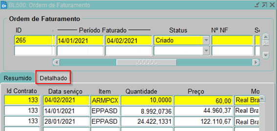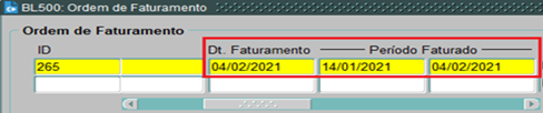 O campo “Dt Faturamento” é a informação que foi inserida no campo “Data Faturamento” na tela BL300: Gerar Ordem de Faturamento. O campo “Período Faturado” é a informação que foi inserida no campo “Intervalo de exportação” na tela BL300.