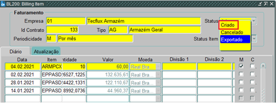 Após a OF ter sido gerada através da tela BL300, o status das linhas na tela BL200 é alterado para “Exportado”, pois uma vez que a linha é contemplada numa OF, ela não pode mais ser atualizada em um nova Ordem de Faturamento. Somente as linhas que entraram na OF que foi gerada terão o seu status alterado.