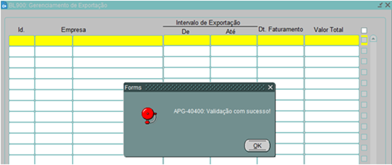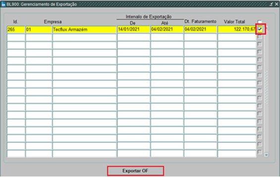 Depois de realizar a análise da OF que foi criada, é necessário realizar a exportação através da tela BL900: Gerenciamento de Exportação, marcando com um flag a OF que será exportada e clicar no botão “Exportação OF”.