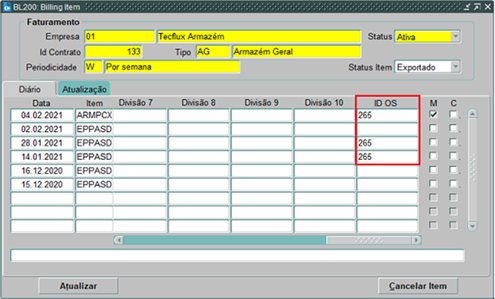 - Serviço: Preenchido para atualizar um item de faturamento específico. Exemplo: APOPSD - Armazenagem por pallet sem divisão.
