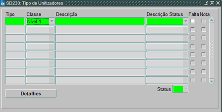 Após preencher a tela e salvar, devemos clicar no botão “Detalhes”, para terminar de configurar o unitizador na tela SD230D: Tipo Unitizador (Detalhes).
