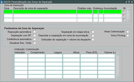 Ao acessar o menu, será exibida a tela SD279: Parametrização das Zonas de Separação, em verde, pronta para começar inserir a zona de separação e os parâmetros da zona de separação.