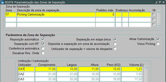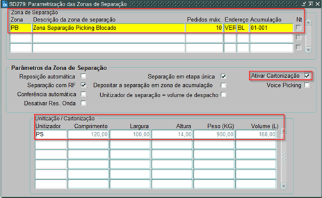 Devemos selecionar a zona de separação e marcar um flag nos parâmetros necessários. É importante marcar o campo “Ativar Cartonização”, para que o processo da quebra de lote da cartonização seja executado.