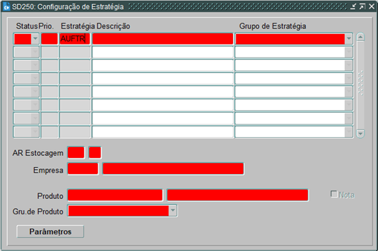 Ao acessar o menu, será exibida a tela SD250: Configurações de Estratégia, onde devemos pesquisar “AUFTR” no campo estratégia, para inserir as respectivas configurações.