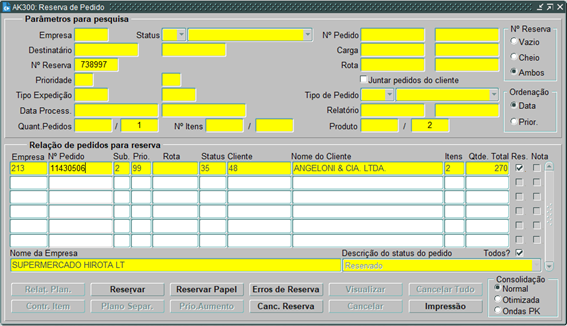 Atualizando a consulta pelo nº do pedido na AK100: Criação e Consulta de Pedidos, podemos verificar que o status do pedido foi atualizado para 35-Reservado.