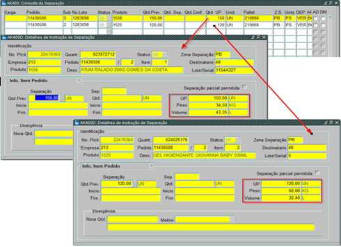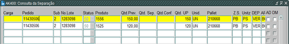 Consultando o pedido na tela AK400: Consulta da Separação, onde é possível identificar a quebra dos Lotes de Separação efetuada no ato da reserva, conforme parametrização do processo de Cartonização.