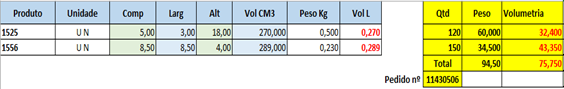 Conforme é possível verificar, a somatória de Peso ou Volumetria dos itens do pedido não ultrapassou a capacidade máxima de volumetria 120L e 100Kg.
