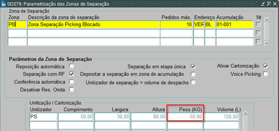 Ao consultar a tela SD279 é possível verificar a capacidade máxima de Peso e Volumetria de cada embalagem (cadastradas na SD230: Tipo de Unitizadores).