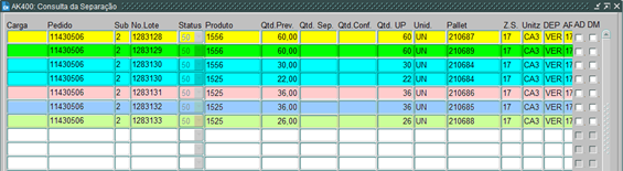 Depois de realizado o processo de reserva na AK300, a consulta na AK400 deve ser feita pelo número do pedido. É possível observar que foram gerados 6 (seis) lotes de separação.