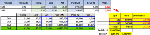 Podemos analisar, na planilha a seguir, como o sistema calculou e condicionou da melhor forma possível a acomodação dos produtos, otimizando caixas e respeitando todas as regras de separação.