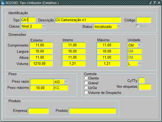 As informações do grid “Unitização/Cartonização” são referenciadas da tela SD230: Tipo de Unitizadores.