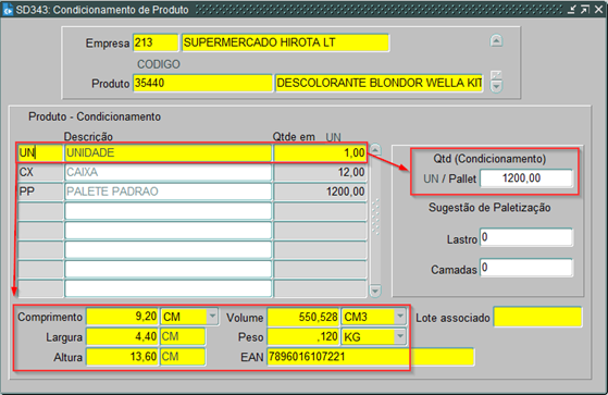 Para acessar o cadastro dos produtos com suas cubagens, devemos ir ao menu Conceitos Principais/Cadastro/SD343: Condicionamento de Produto.