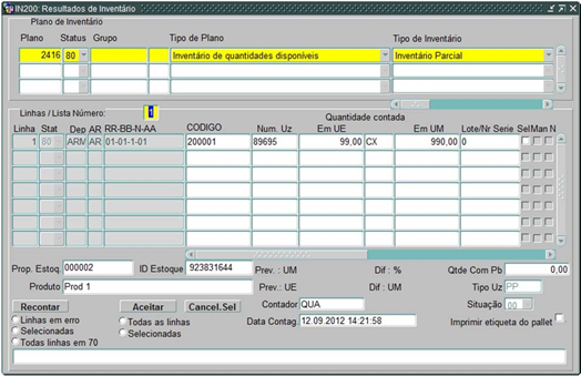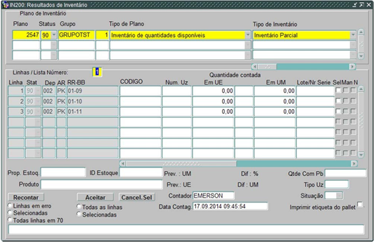 Após a realização do inventário, podemos consultar os resultados obtidos na tela IN200 do WMS Alcis.
