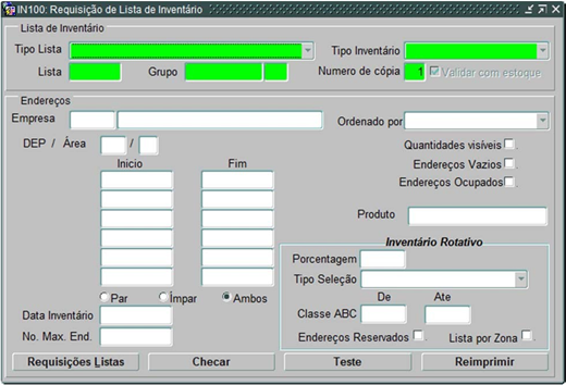 Para realizar um inventário no armazém, deve-se primeiramente, criar uma lista de inventário no sistema. Para isso é necessário utilizar a tela IN100 que pode ser acessada pela tela principal “Informação”, tendo assim que digitar o número da tela e confirmar, ou pelo menu “Funções” → “Inventário” → “IN100: Requisição de Lista de Inventário”.