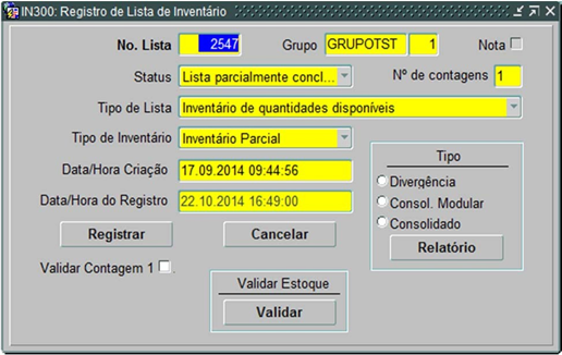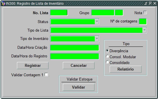 No bloco “Linhas”, há um campo chamado “Lista Número”, que é gerado automaticamente pelo sistema no momento da criação do plano de inventário na tela IN100 (tela comentada anteriormente). A princípio, o número da lista já deve estar configurado como “1”. No momento da validação, caso exista divergência na contagem de estoque, o sistema cria uma nova lista (“0”), que será utilizada para realizar a recontagem e revalidação do estoque.