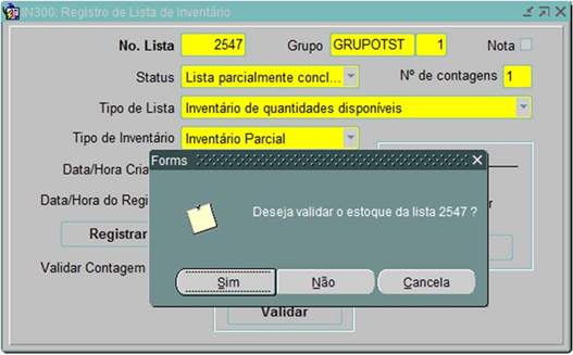 Em seguida, é preciso informar o número da lista, que indica se é a lista de inventário principal (1), as secundárias ou recontagens (0).
