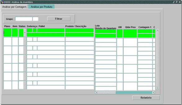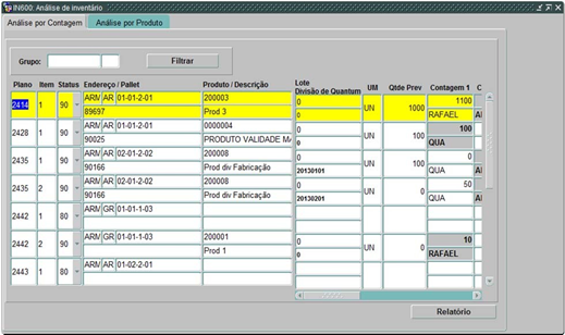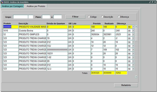 O botão “Relatório” executa um relatório de análise de inventário por produto.