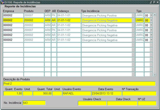 Após realizar a contagem, o sistema gera um reporte de Incidência na EV100, relatando o processo de checagem do picking realizado.