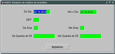 O depósito desejado no relatório deve ser informado no campo “DEP”, e o intervalo das áreas desejadas deve ser informado nos campos “Da Área” e “Até Área”.