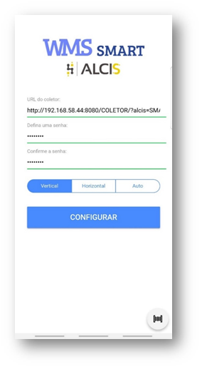 Esta tela tem a finalidade de vincular o coletor web ao seu dispositivo. É composta por URL do coletor, senha para administração e opção de posicionamento da câmera. Todos os campos devem ser preenchidos.