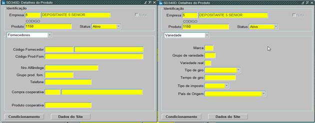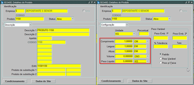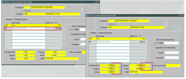Ao utilizar o botão Condicionamento, será exibida a tela SD343, onde é possível fornecer os dados de condicionamento, dimensões e códigos de barras (EAN ou DUN) do produto, tanto na unidade mínima (por exemplo, KG), na unidade intermediária (por exemplo, CX) ou no pallet completo (por exemplo, PP).