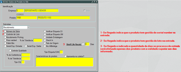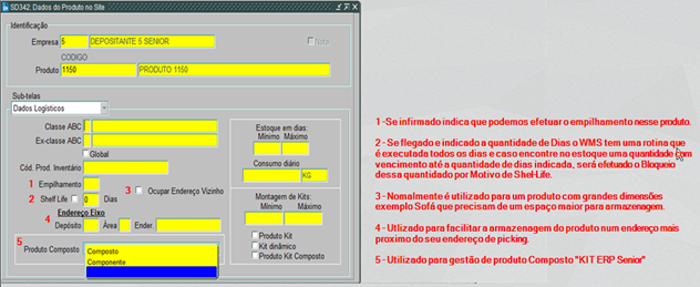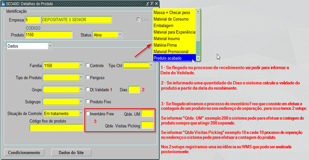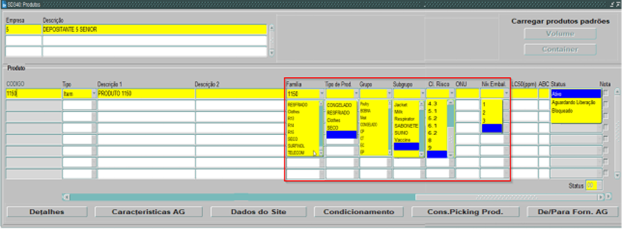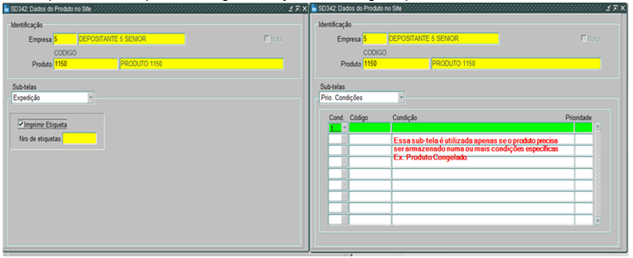 A tela Expedição é automaticamente parametrizada durante o cadastro do produto. Por outro lado, a tela Prio. Condições é utilizada para indicar se o produto possui alguma condição específica de armazenamento.