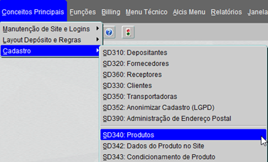 Primeiro, acesse a tela de produtos através do menu Conceitos Principais > Cadastro > Produtos ou pelo código da tela (SD340).