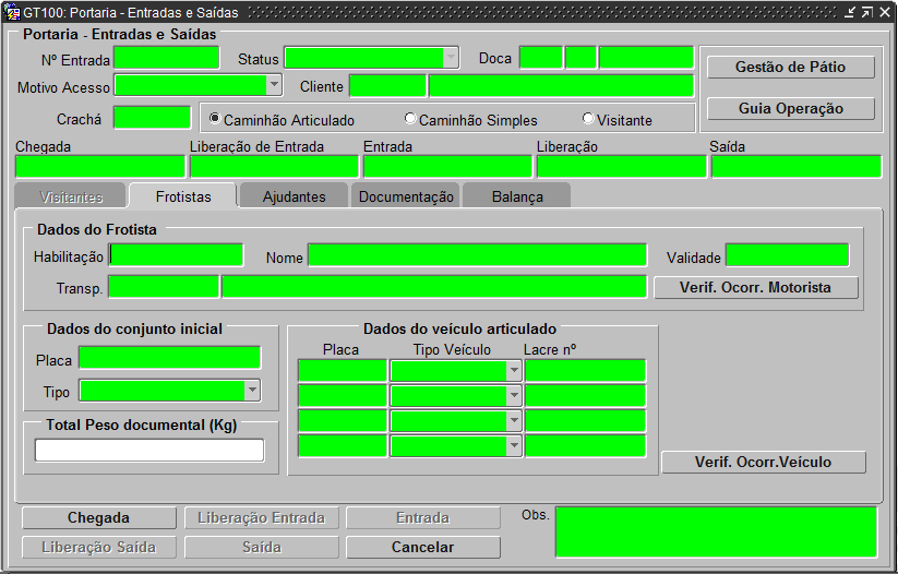 Após a inicialização da portaria, completar os dados e dar sequência aos processos, seguindo as regras estabelecidas. Se utilizar ajudantes; ou controla balança; ou se obrigatório documentos; se tem algum tipo de observação a ser anotada ou algum tipo de autorização para seguir adiante.
